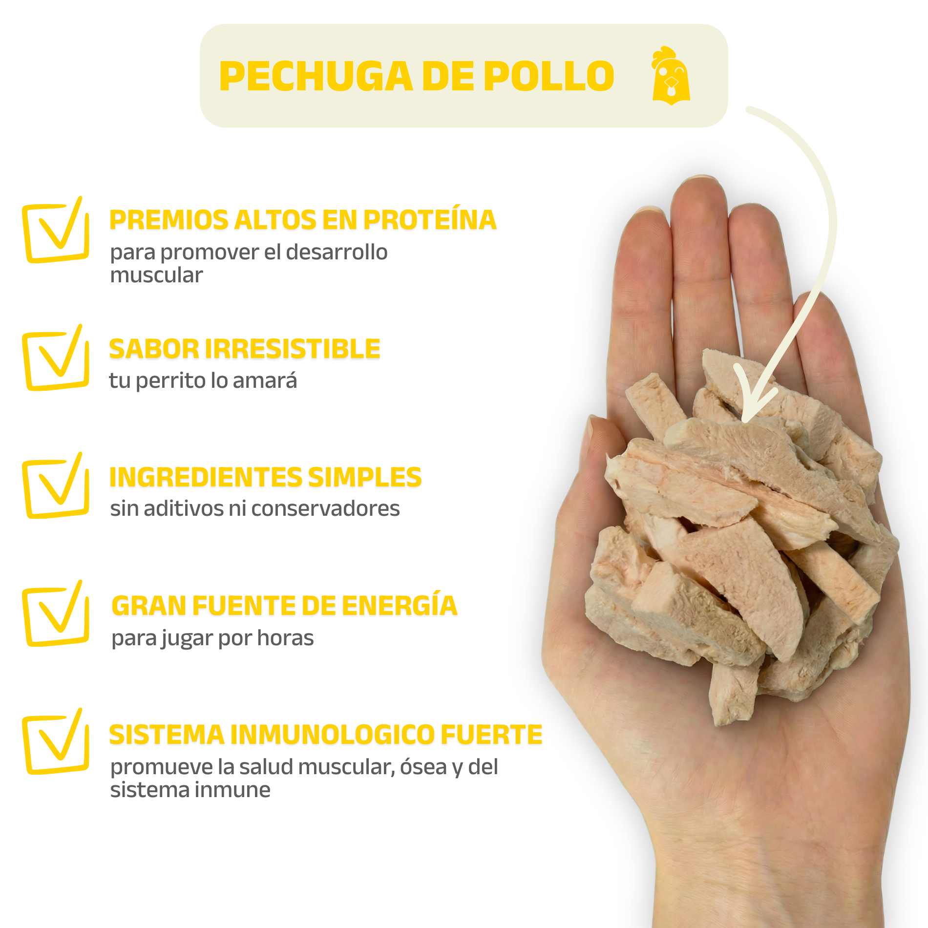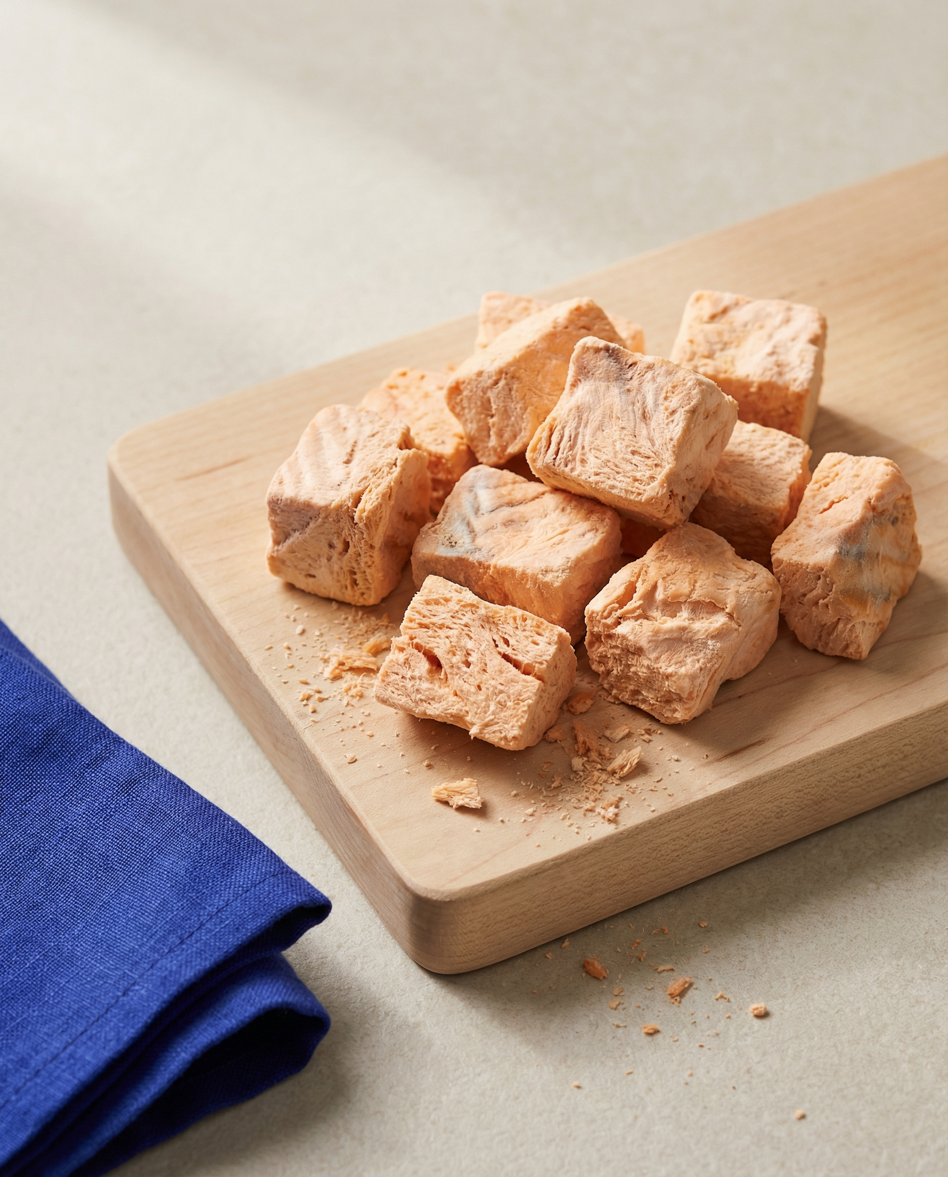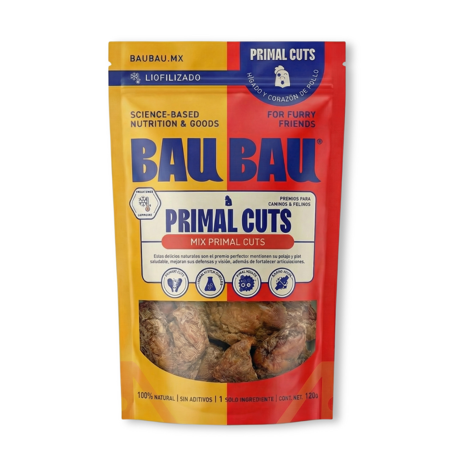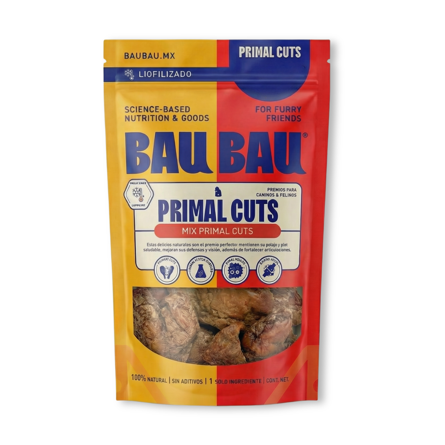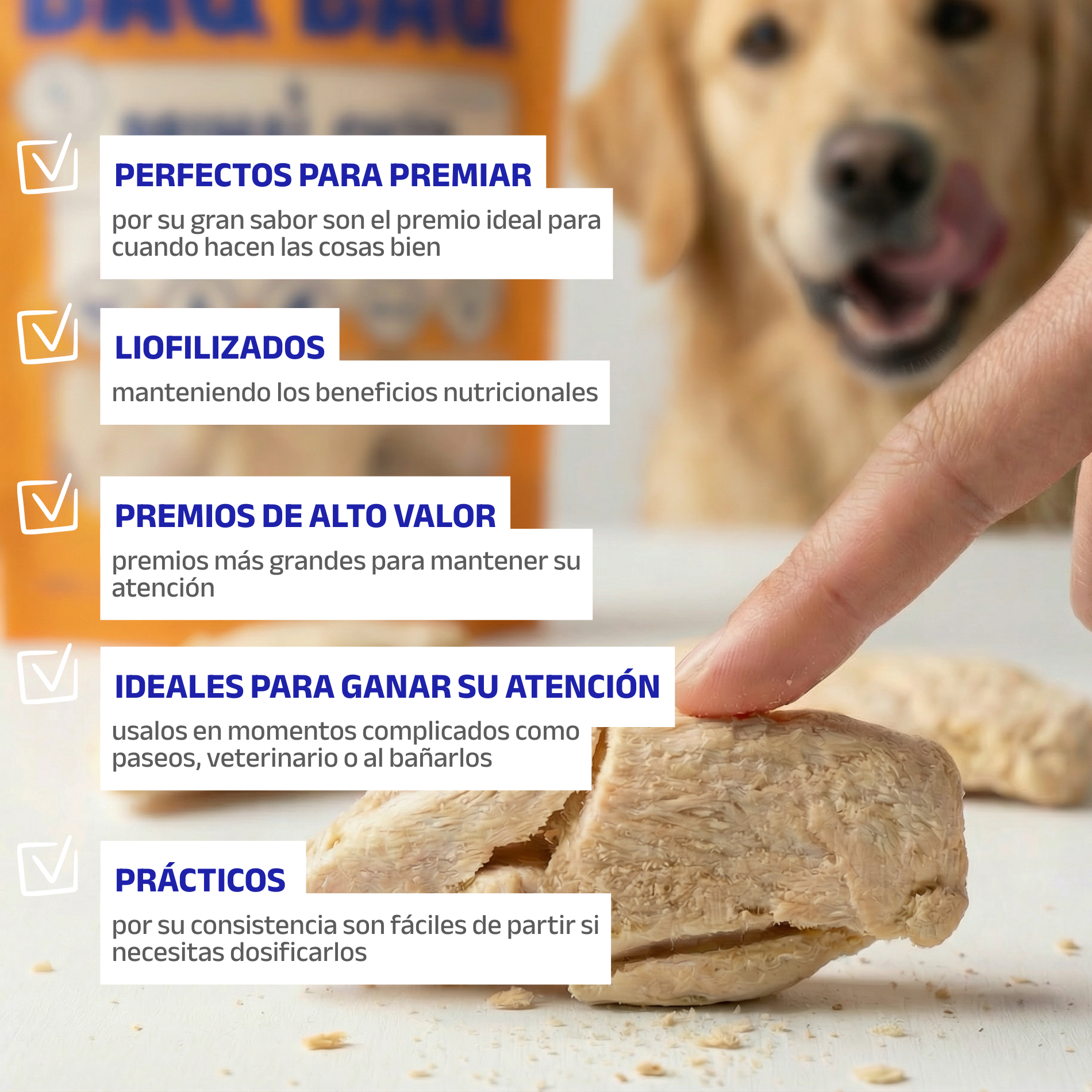 Cubitos liofilizados de proteína real, ideales para premiar rápido y seguido. Su tamaño los hace perfectos para entrenamiento, paseos y juegos de olfato, sin saturar a tu perro.