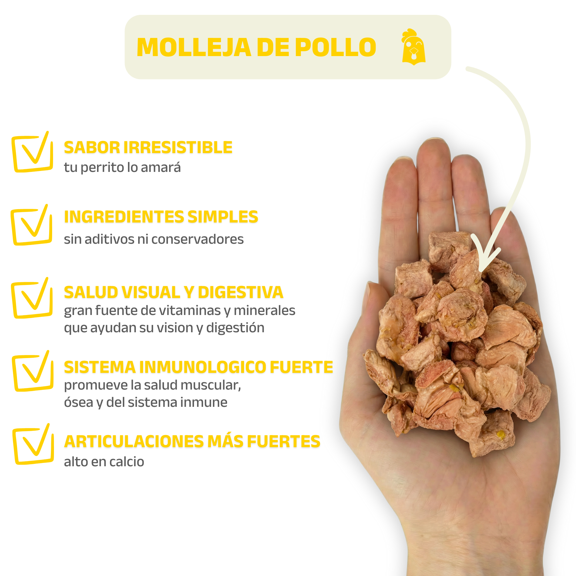 Cubitos liofilizados de proteína real, ideales para premiar rápido y seguido. Su tamaño los hace perfectos para entrenamiento, paseos y juegos de olfato, sin saturar a tu perro.